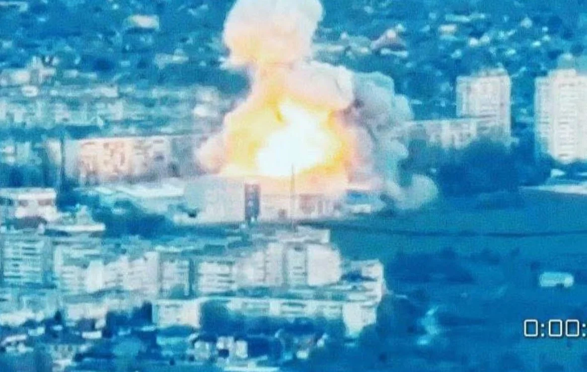 Росіяни оприлюднили відео, на якому зафіксовано момент влучання чотирьох авіаційних бомб у будівлю льодового палацу у Херсоні.