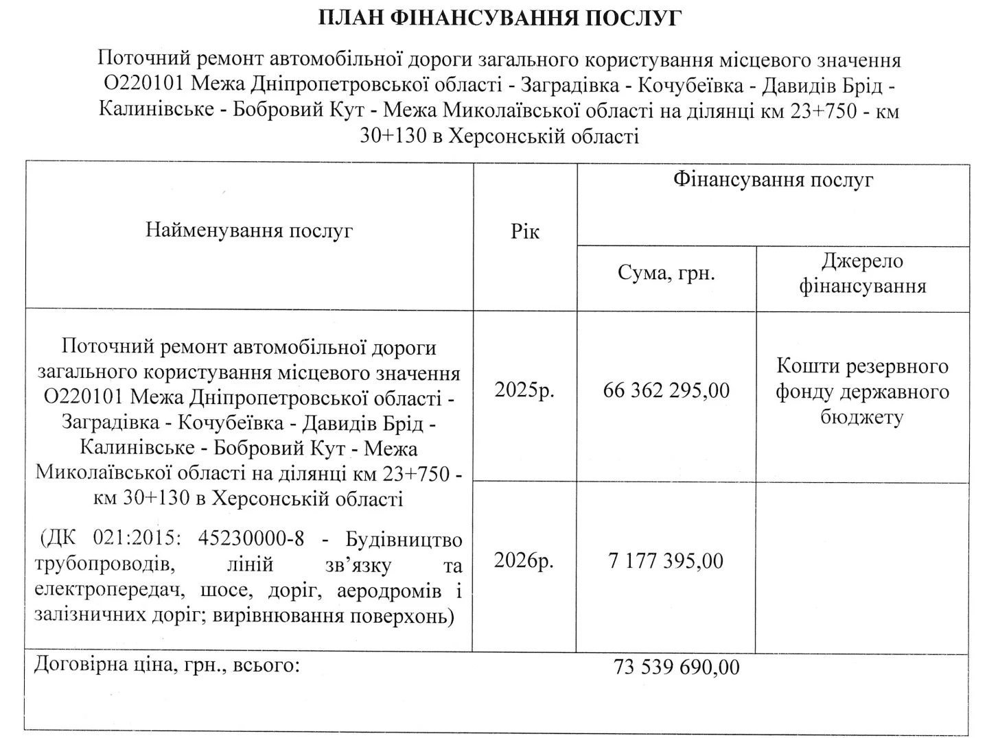 Як вказано у договорі, фінансування здійснюватиметься за рахунок коштів резервного фонду державного бюджету. Роботи планується виконати до кінця 2026 року. Договір передбачає гарантійний термін на відновлене дорожнє покриття – 3 роки, а також відповідні гарантійні строки на дорожні знаки та розмітку.