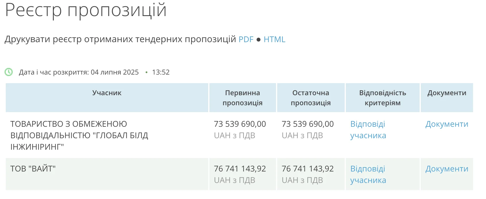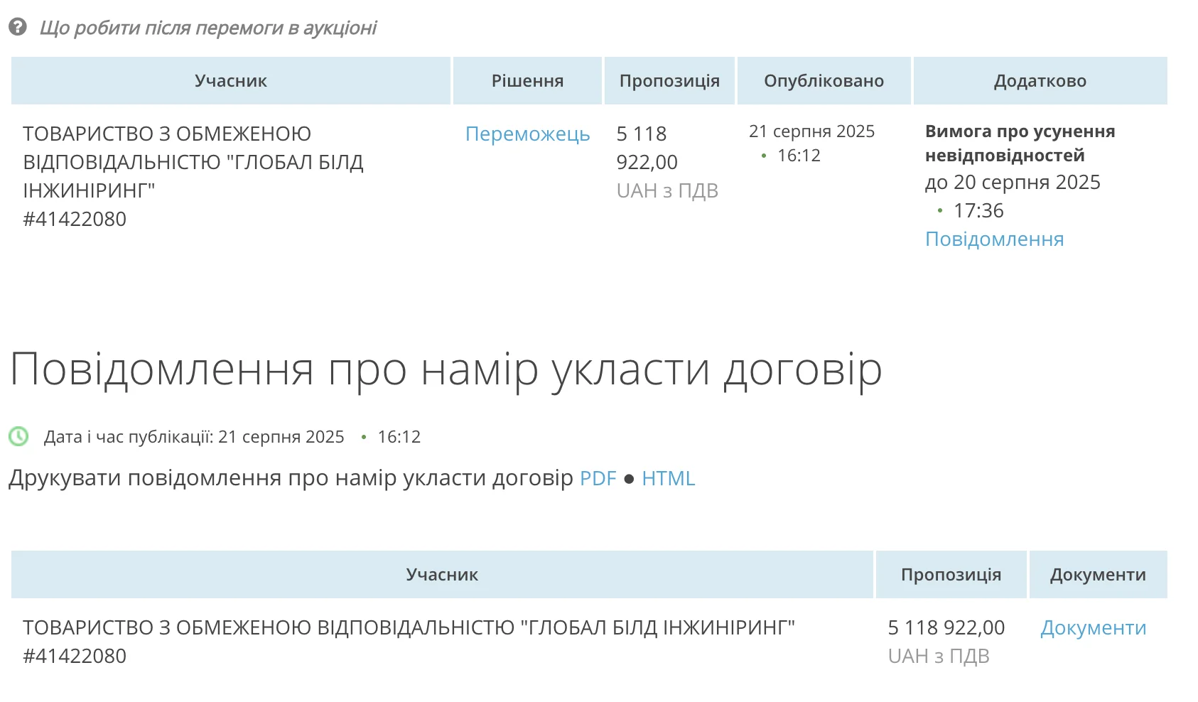 “Глобал Білд Інжиніринг” запропонувала виконати роботи дешевше ніж її конкурент, тож саме з нею й підписали контракт вартістю 73,5 млн грн.