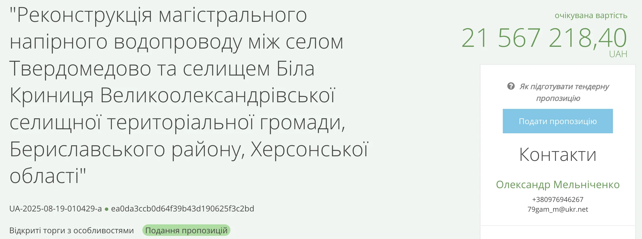 Як вказано на Prozorro, 19 серпня Великоолександрівська селищна рада оголосила закупівлю, яка проводиться за процедурою відкритих торгів з особливостями.