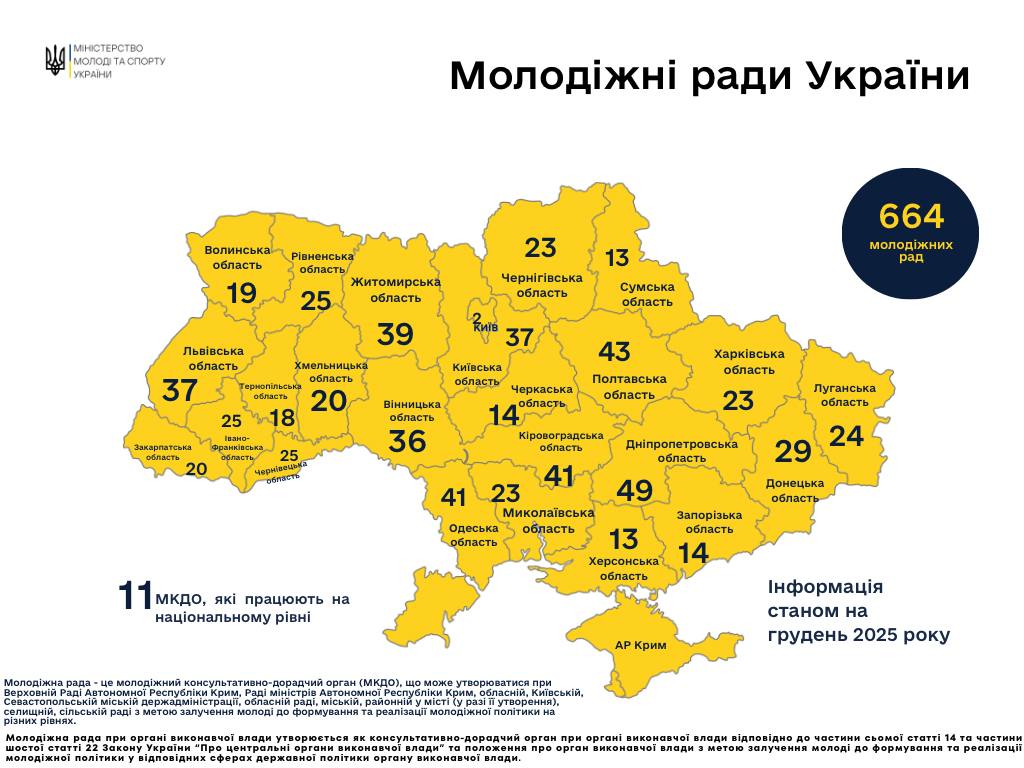 Загалом в Україні наразі працюють 664 молодіжні ради. З них 624 — місцевого рівня, 29 — регіонального та 11 — національного рівня.