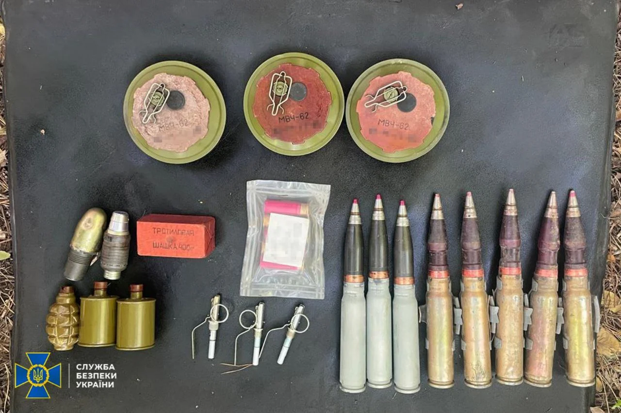 Під час проведення огляду схованки додатково виявлено: корпуси гранат РГО, РГ-42, Ф-1, РГД-5 із запалами, п’ять тротилових шашок та понад 200 набоїв різного калібру до автоматичної зброї.