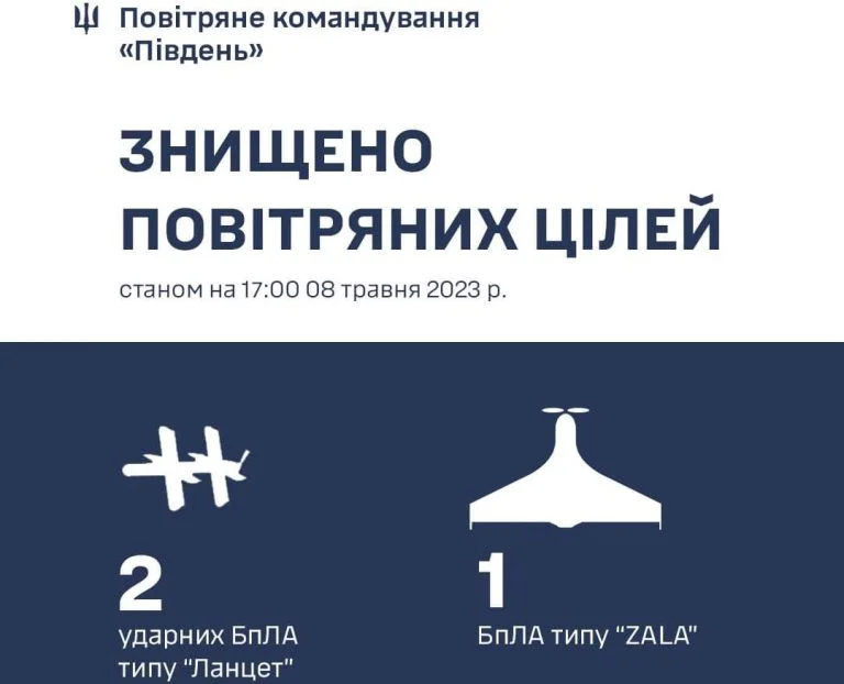 Українські військові знищили 3 російських безпілотних літальних апарата: 2 ударних БпЛА типу “Ланцет” та один безпілотник типу “ZALA”.