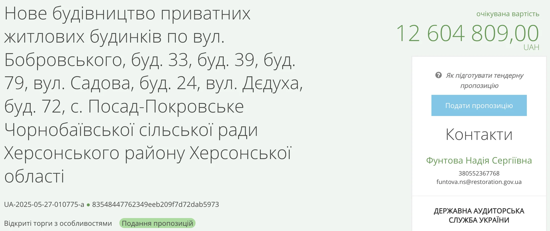 Служба відновлення та розвитку інфраструктури у Херсонській області оголосила тендери на будівництво ще 28 будинків у селі Посад-Покровське.