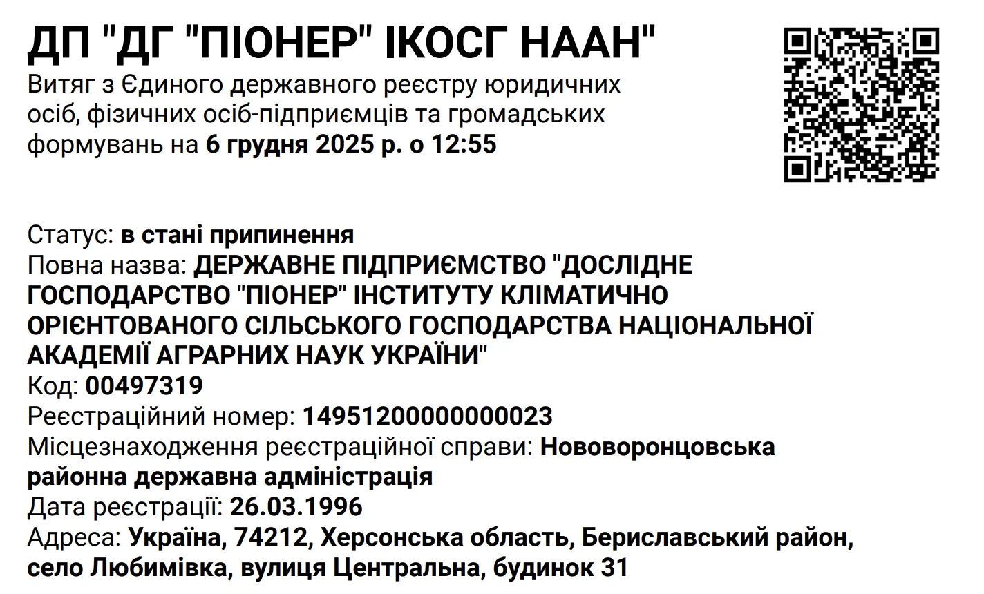 Дослідне господарство “Піонер” підпорядковується Нацакадемії аграрних наук України, яка й прийняла рішення щодо припинення діяльності підприємства в результаті реорганізації.