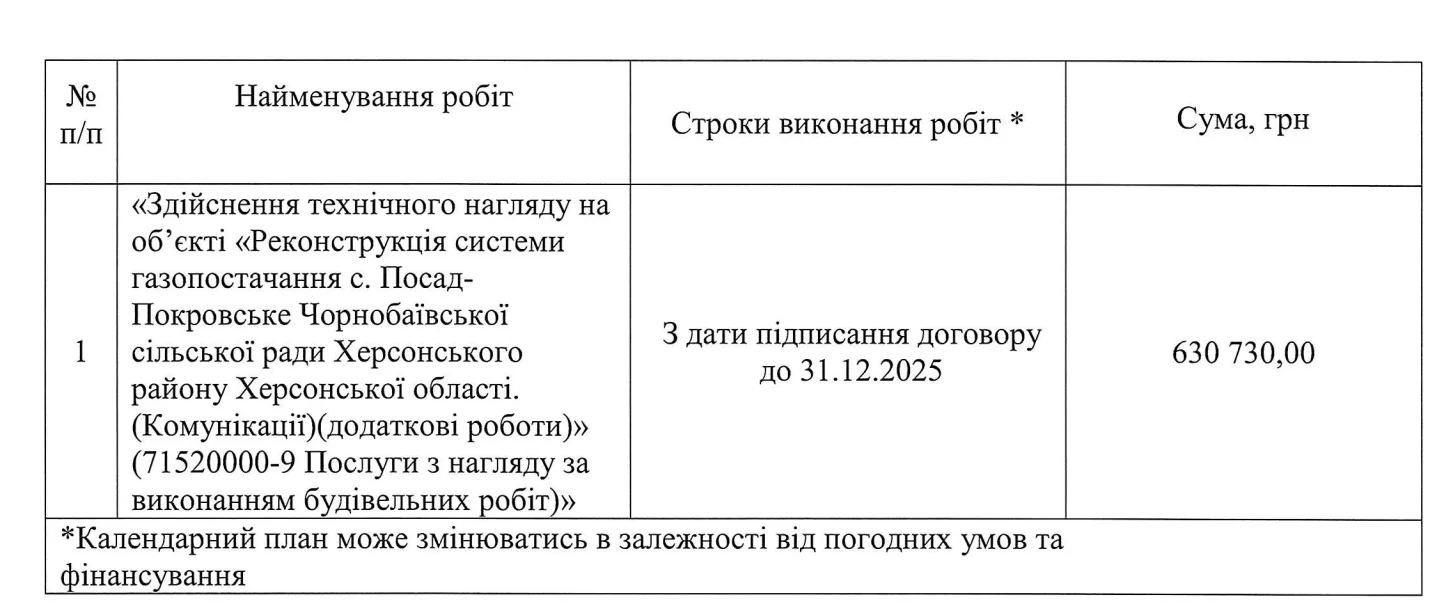 На нагляд за реконструкцією системи газопостачання у селі Посад-Покровське на Херсонщині виділили ще 630 тис. грн.