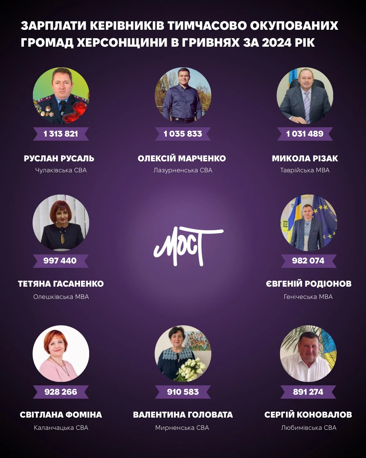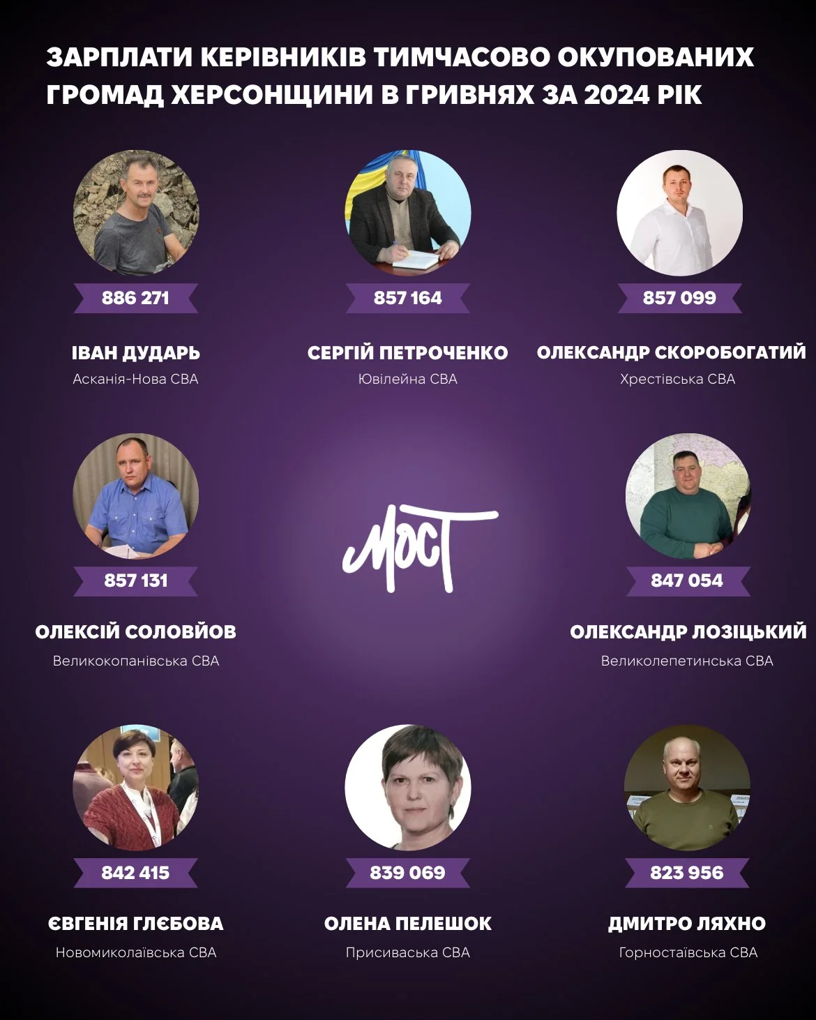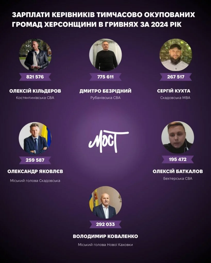 Журналісти МОСТа проаналізували декларації начальників військових адміністрацій окупованих громад за 2024 рік та з’ясували, що торік двадцять начальників та начальниць, а також два мери загалом отримали понад 17 млн грн. Зазначимо, що сума вказана без урахування заробітних плат керівників, декларації яких недоступні на сайті НАЗК через безпекові питання.
