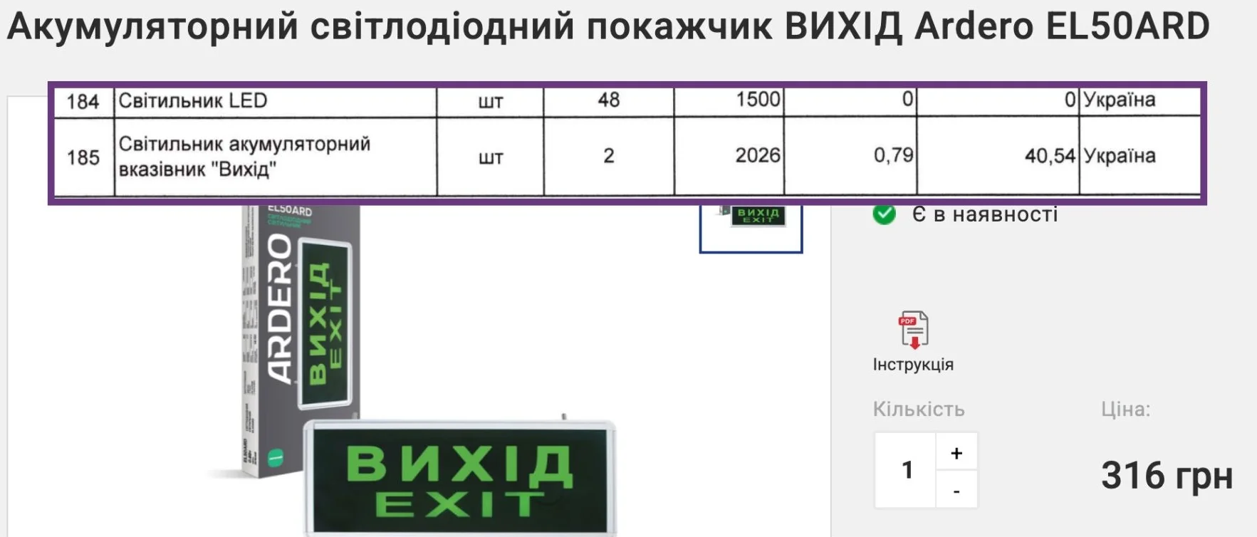 А два акумуляторних вказівники “Вихід” міська влада купує у Нечая за 2026 грн/шт, хоча в інтернет-магазинах подібні коштують в діапазоні 300-600 грн/шт.