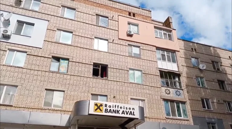 На кадрах видно пусте місто – людей мало, черги біля банку, а будівлі мають численні руйнування.