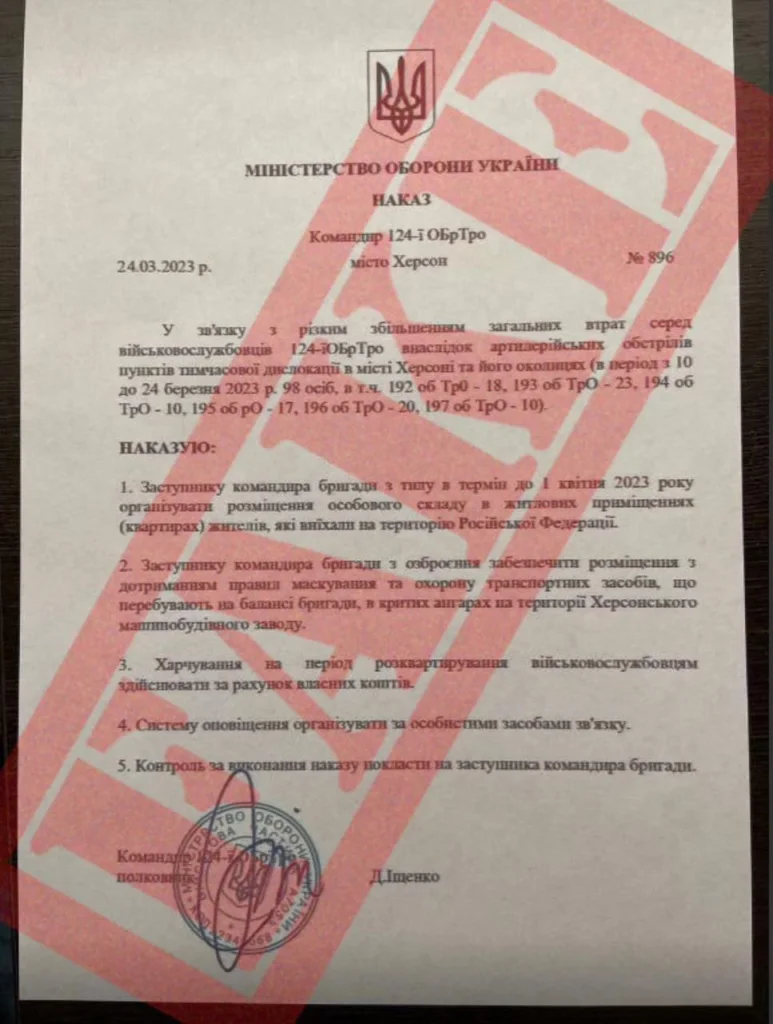 У “наказі”, який розійшовся проросійськими телеграм-каналами, йдеться про те, що “особовий склад 124 бригади необхідно розмістити в квартирах жителів, які виїхали на територію РФ до 1 квітня”. Харчування та особисті засоби зв’язку “рекомендують” забезпечити власним коштом.