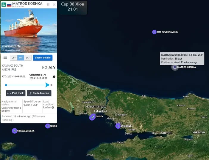 Російське судно MATROS KOSHKA з 3 по 7 жовтня 2025 року вивезло з тимчасово окупованого Криму ще понад 27 тисяч тонн викраденого з Херсонщини та Запоріжжя українського зерна.