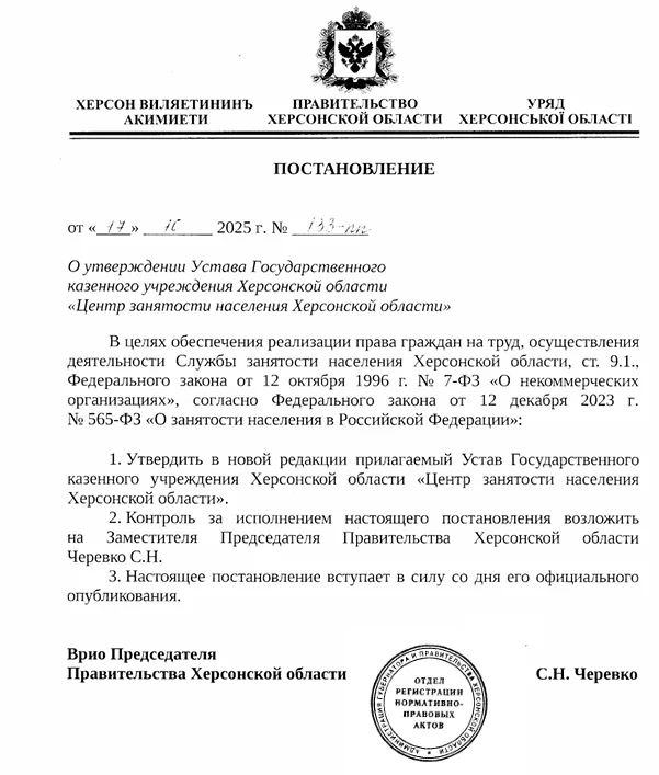 Документ датований 17 жовтня цього року і передбачає затвердження нового статуту “державної казенної установи Херсонської області” за російським законодавством.