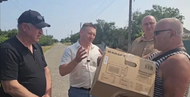 На кадрах видно, як окупаційний голова Скадовського округу (адміністративна одиниця росіян, – МОСТ) Олександр Дудка разом зі своїм так званим радником Артуром Агададяном вручають мікрохвильовку чоловікові, чий син загинув у війні проти України.