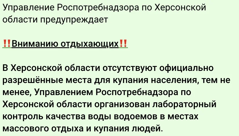 За даними так званого Управління Росспоживнагляду, на тимчасово окупованій території Херсонської області відсутні офіційно дозволені місця для купання населення, а вода у водоймах у шести популярних локаціях не відповідає санітарно-гігієнічним і мікробіологічним нормам.