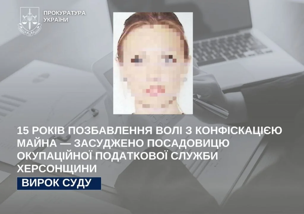 Також відомо, що інспекторці податкові у Херсоні Марії Кулагіній призначили 15 років позбавлення волі за колабораціонізм.