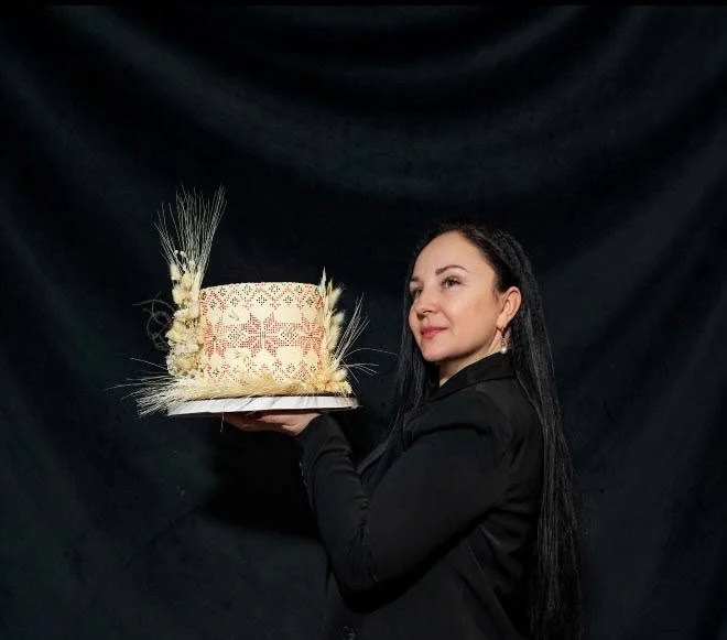 Дизайн торта – вишиванка з композицією із колосків, які, за словами Олени, символізують Чорнобаївку.