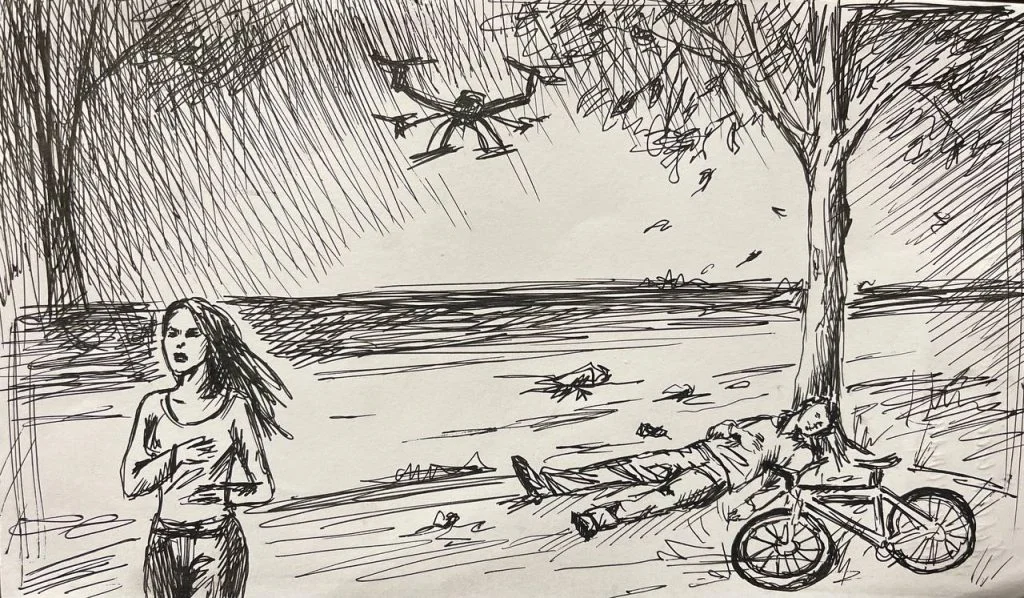 Після того, як він потрапив під обстріл, то ще близько п’яти хвилин лежав і спостерігав за ворожим дроном, перш ніж на велосипеді поїхав додому.