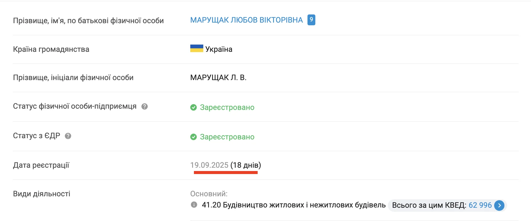 За даними системи бізнес-аналітики YouСontrol, Любов Марущак зареєструвалась як ФОП 19 вересня.