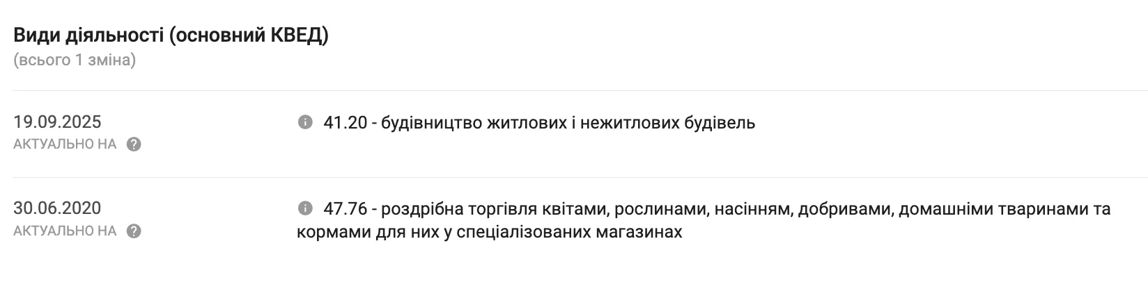 Цього ж разу основним КВЕДом Марущак вказала “Будівництво житлових і нежитлових будівель”, а до нього обрала ще 38 додаткових – від будівництва доріг і автострад до оптової торгівлі.