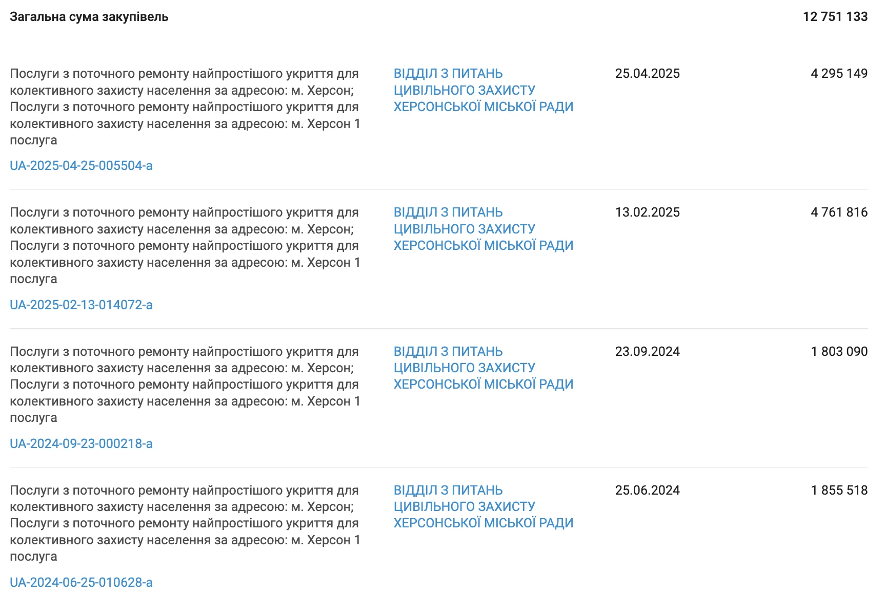 Так, відділ з питань цивільного захисту Херсонської міської ради, який очолює колишній правоохоронець Микола Прусов, 2 жовтня уклав два договори, замовивши послуги з поточного ремонту найпростіших укриттів для колективного захисту населення. Інформація про це опублікована на Prozorro.