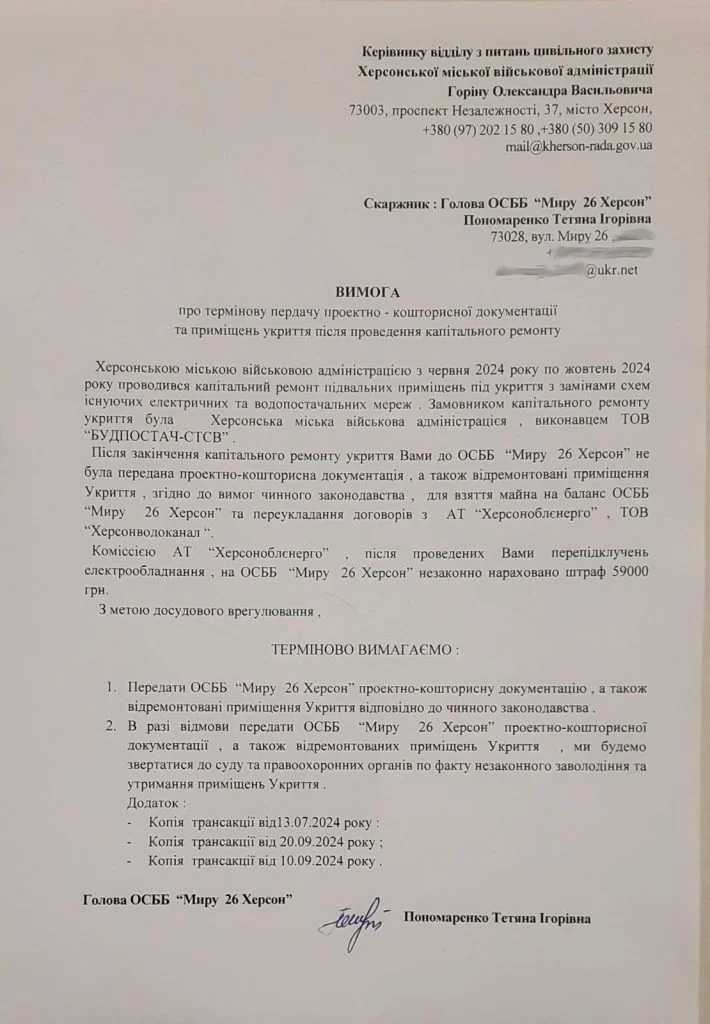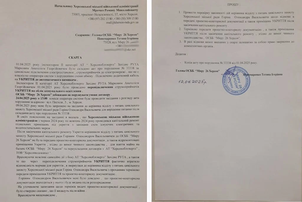 Після розмови з Олександром Горіним голова ОСББ «Мира 26 Херсон» Тетяна Пономаренко направила Роману Мрочко, який на той момент був начальником ХМВА скаргу на дії начальника відділу з питань цивільного захисту.