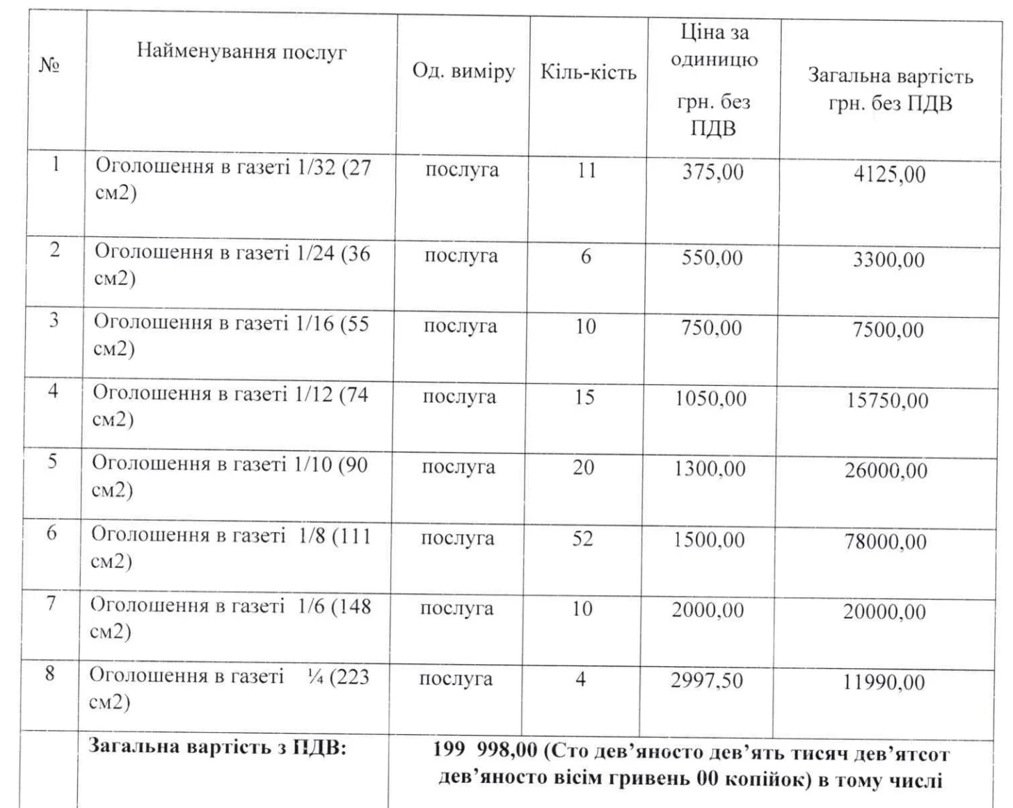 За 199 тис. грн газета має опублікувати 128 повідомлень.