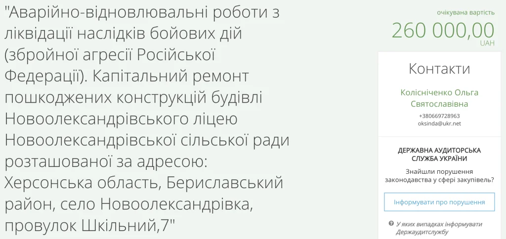 На розробку проєкту капітального ремонту будівлі ліцею у селі Новоолександрівка Бериславського району виділено 260 000 гривень.