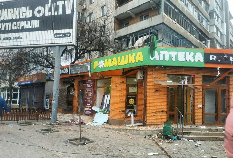 Снаряд впав на перехресті проспекту Святих Кирила і Мефодія та вулиці Лавреньова. Пропагандисти стверджують, що там розміщувалася артилерія ЗСУ.