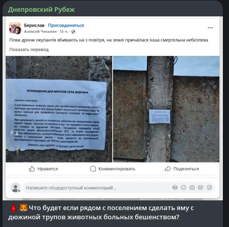“Що буде, якщо поруч із поселенням зробити яму з дюжиною трупів тварин, хворих на сказ? Продовжуємо викривати бардак у Херсонській області на правобережжі, де некомпетентність цвіте та пахне – у прямому розумінні. Мова про неконтрольоване поширення сказу, яке допустили місцеві “керівники” та військові. Це не жарти: дикі собаки та лисиці кусають людей, а вакцин немає, допомоги нуль”, – зазначають адміністратори Telegram-каналу “Днепровский рубеж”.