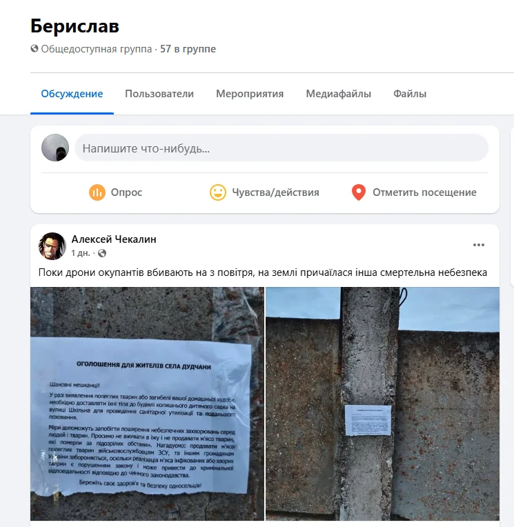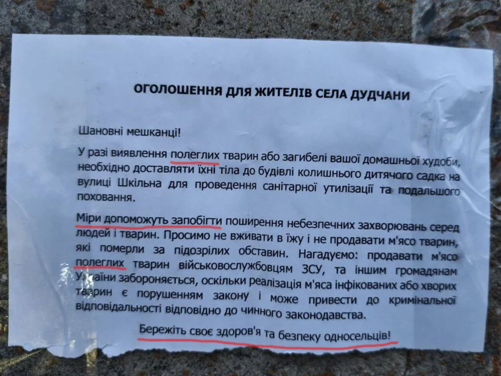 Як доказ своїм словам пропагандисти виклали фото, які нібито були зроблені в населеному пункті Дудчани Бериславського району. На них зображені оголошення, що закликають місцеве населення зносити трупи тварин у відведене місце для подальшого поховання. Для створення ілюзії правдивості своїх повідомлень росіяни оприлюднили ці знімки у одній з бериславських спільнот у соцмережі Facebook.