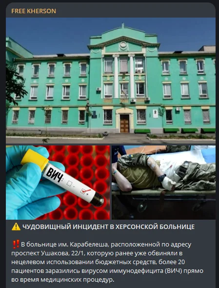 «У лікарні ім. Карабелеша, розташованої за адресою проспект Ушакова, понад 20 пацієнтів заразилися вірусом імунодефіциту (ВІЛ) під час медичних процедур. Перевірка показала, що причиною стала злочинна недбалість лікарів, які не обробили інструменти після обстеження військовослужбовців ЗСУ, а також що в лікарні відсутнє обладнання для знезараження, немає експрес-тестів, а хворих поміщають до загальної палати», – повідомляють росіяни.
