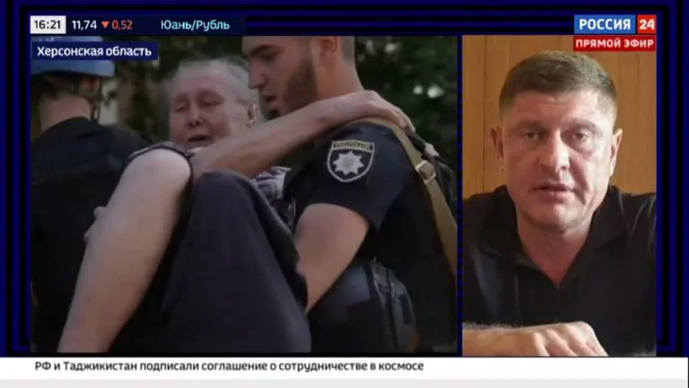 Відео, на якому український поліцейський під час рятувальної операції виносить з човна літню жінку, показав російський державний телеканал «Росія 24», ілюструючи ним інтерв’ю голови створеного окупантами «уряду Херсонської області» Андрія Олексієнка.