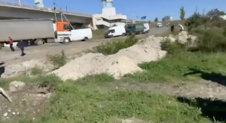 Показуючі на якусь канаву, Стремоусов каже, що це сліди “вибуху”. В цей час на задньому плані з парому спокійно виїзжає вантажівка.