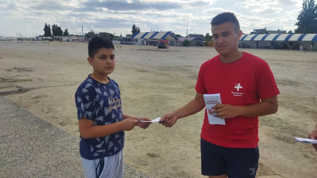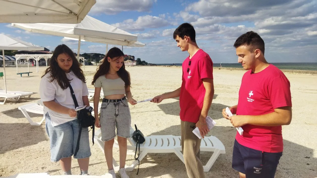 На фото видно, що на пляжі немає людей, є кілька перехожих, яким так звані активісти й роздавали буклети.