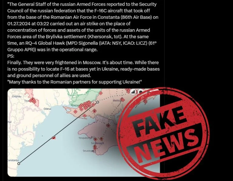 У фейковій заяві йшлось про те, що 27 січня з авіабази ВПС Румунії у Констанці нібито злетів літак F-16C і завдав удар по росіянам в районі Брилівки.