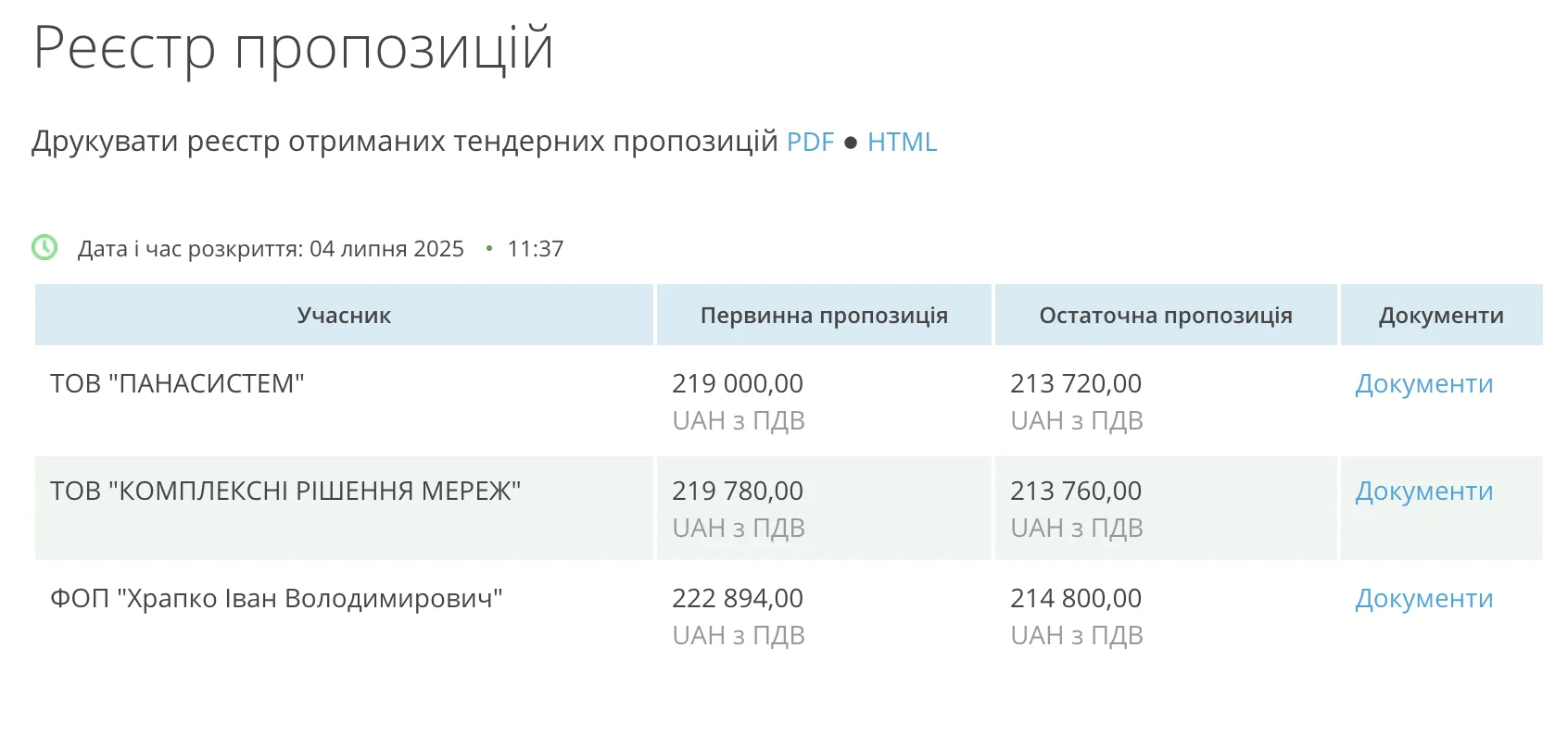 Закупівлю було оголошено в червні. У ній взяли участь три учасники – київське ТОВ “Панасистем”, ТОВ “Комплексні рішення мереж” з Чернівців та ФОП Іван Храпко також з Чернівців.