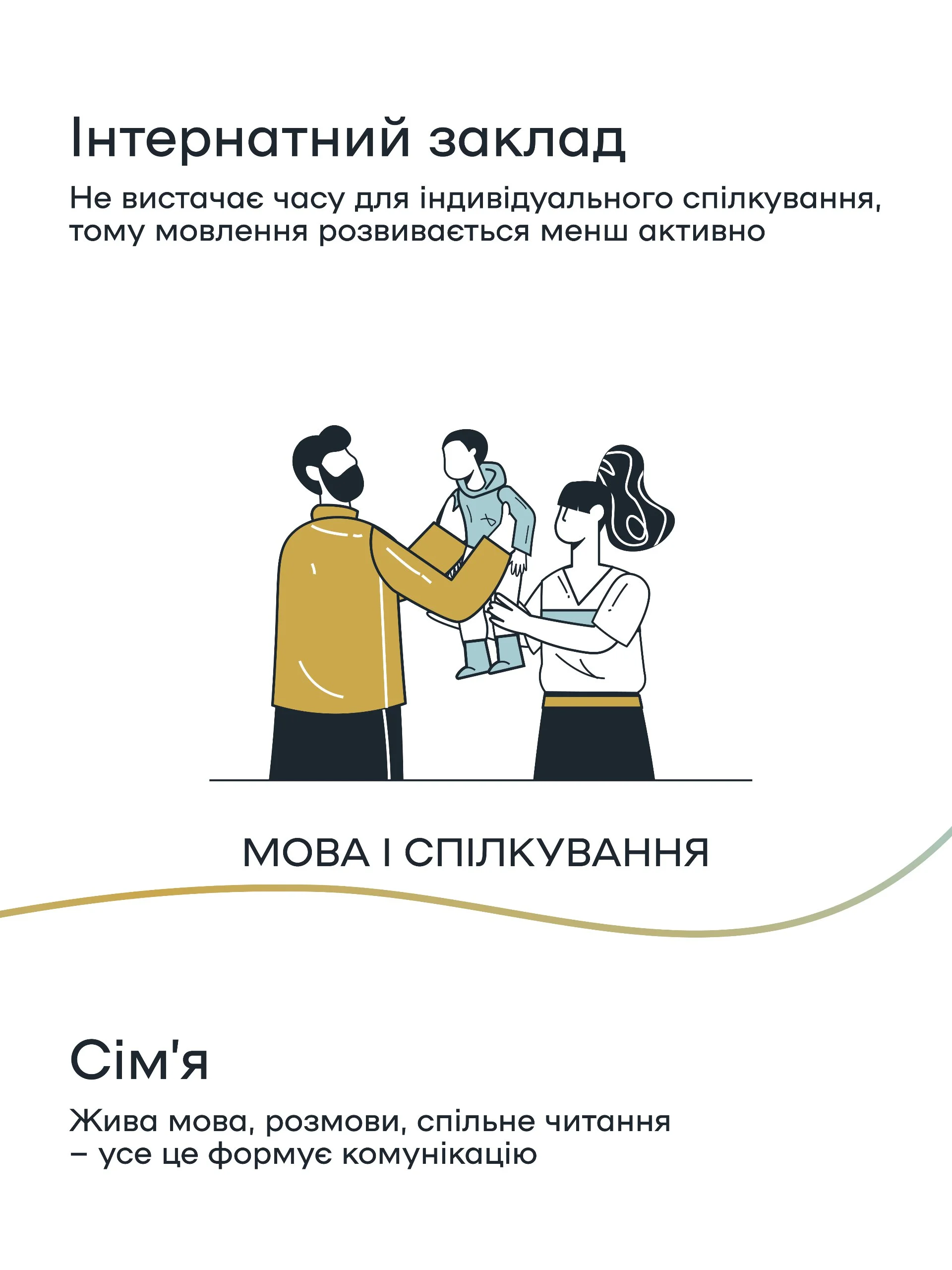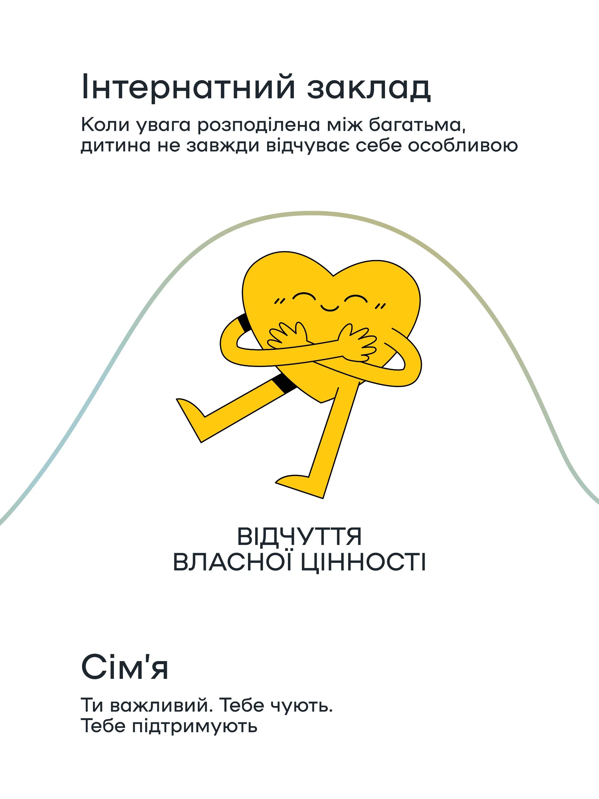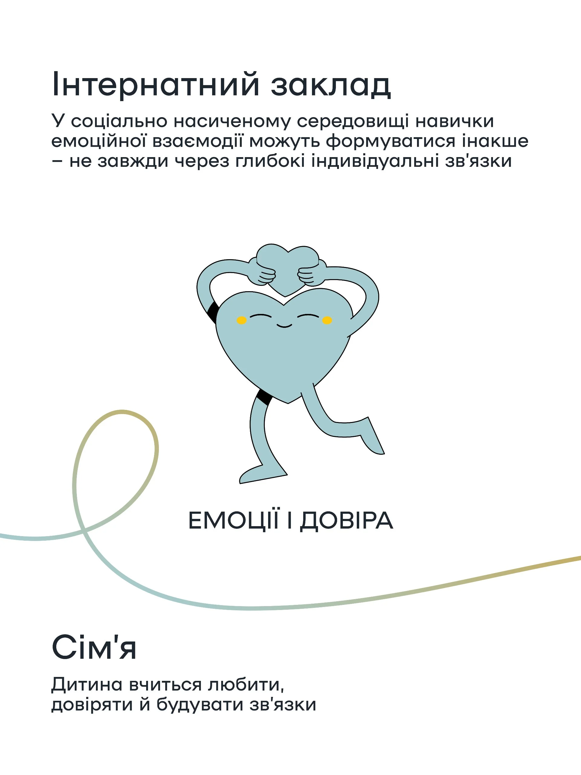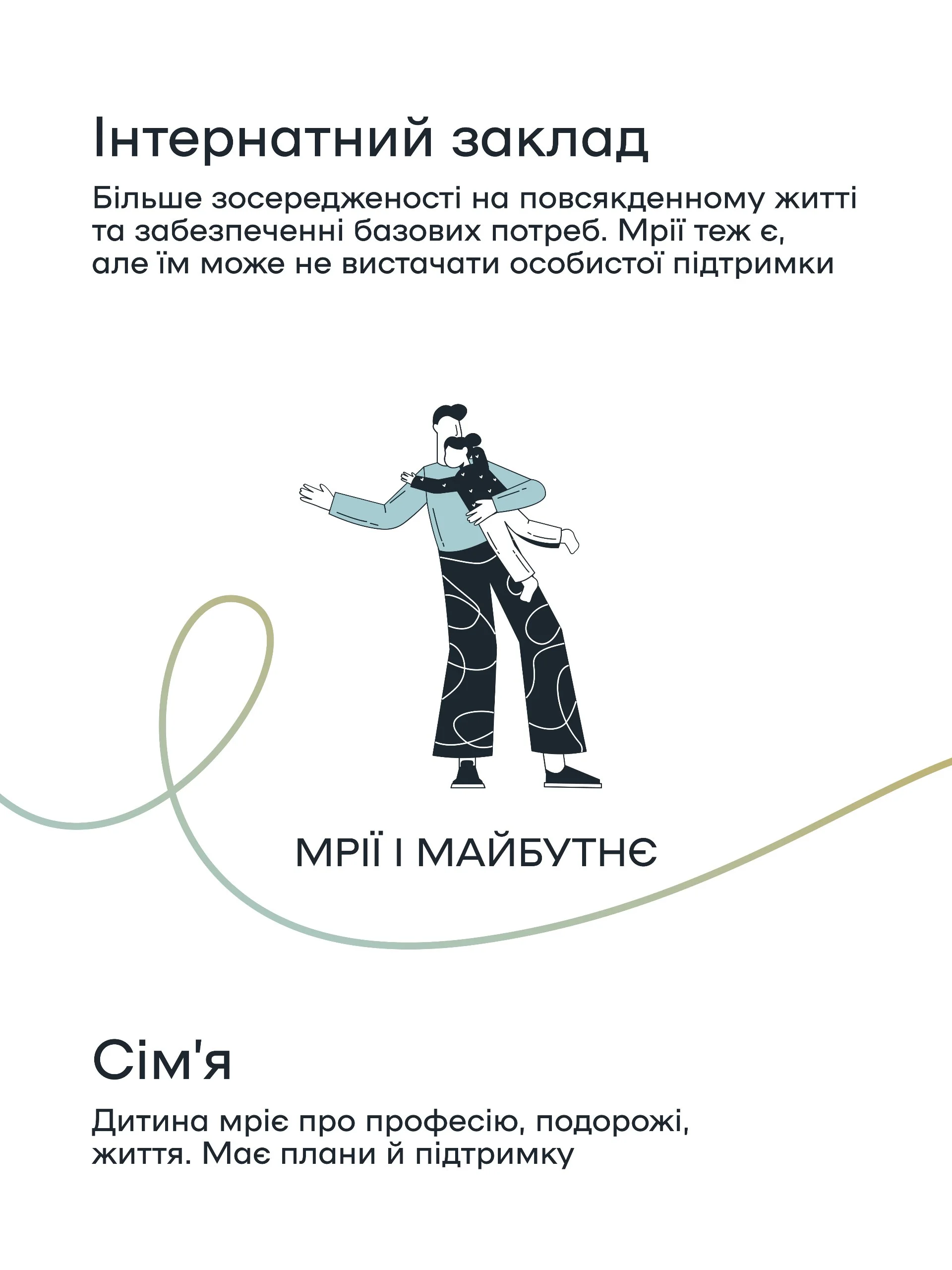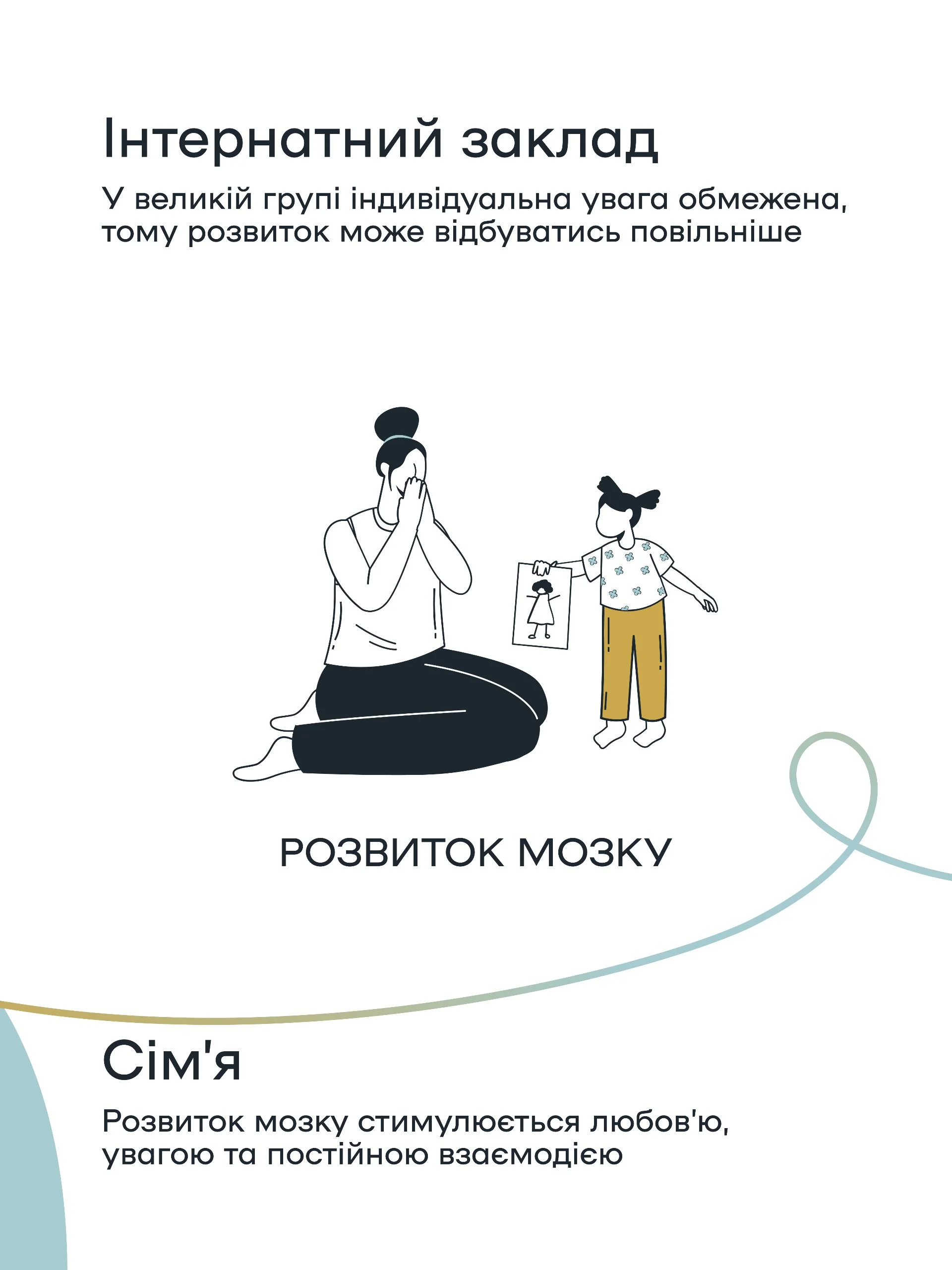 У візуальній серії зібрано п’ять важливих аспектів: від розвитку мозку – до здатності мріяти про майбутнє. Кожен з них показує різницю у перебуванні дитини в сім’ї та інтернатному закладі.