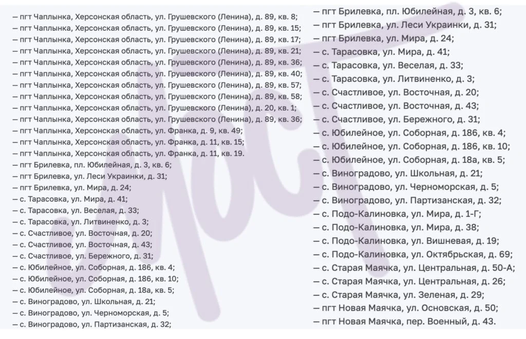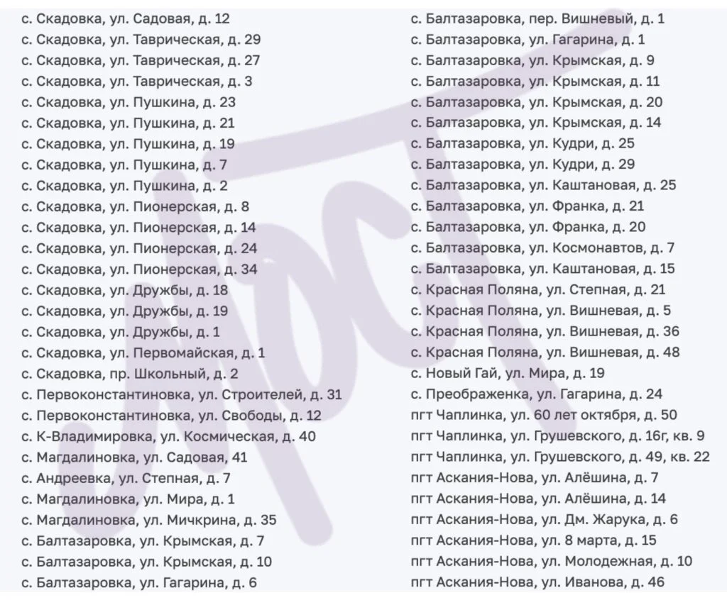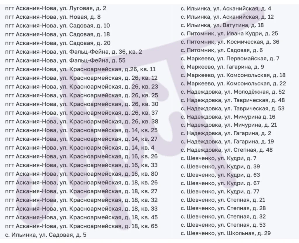 Цього разу окупанти визначили 206 адрес на території так званих Чаплинського, Олешківського та Каланчацького муніципальних округів (територіальна одиниця запровадження незаконною владою, – МОСТ) на лівобережжі Херсонщини.