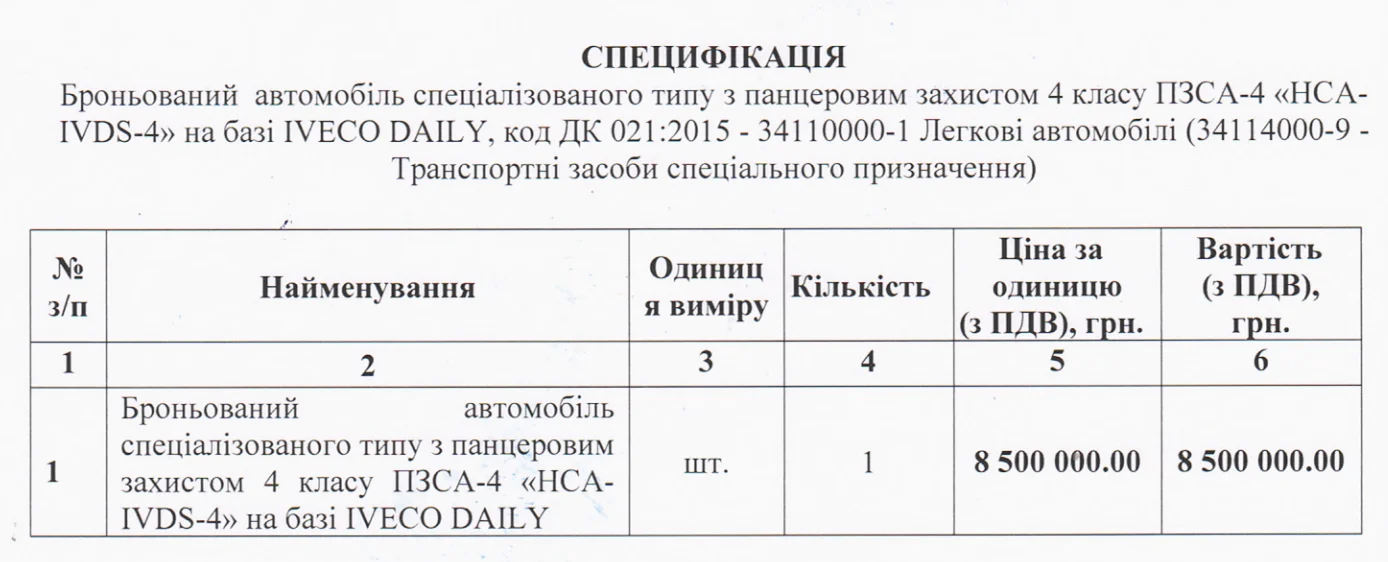 3 липня сільська рада уклала договір з ТОВ “Ніко Спецавто”. Згідно з контрактом, який опубліковано на Prozorro, сільрада купила авто на базі IVECO DAILY зі спеціалізованим панцеровим захистом 4-го класу, тобто таким, що здатен зупиняти бронебійні кулі автоматичної зброї.