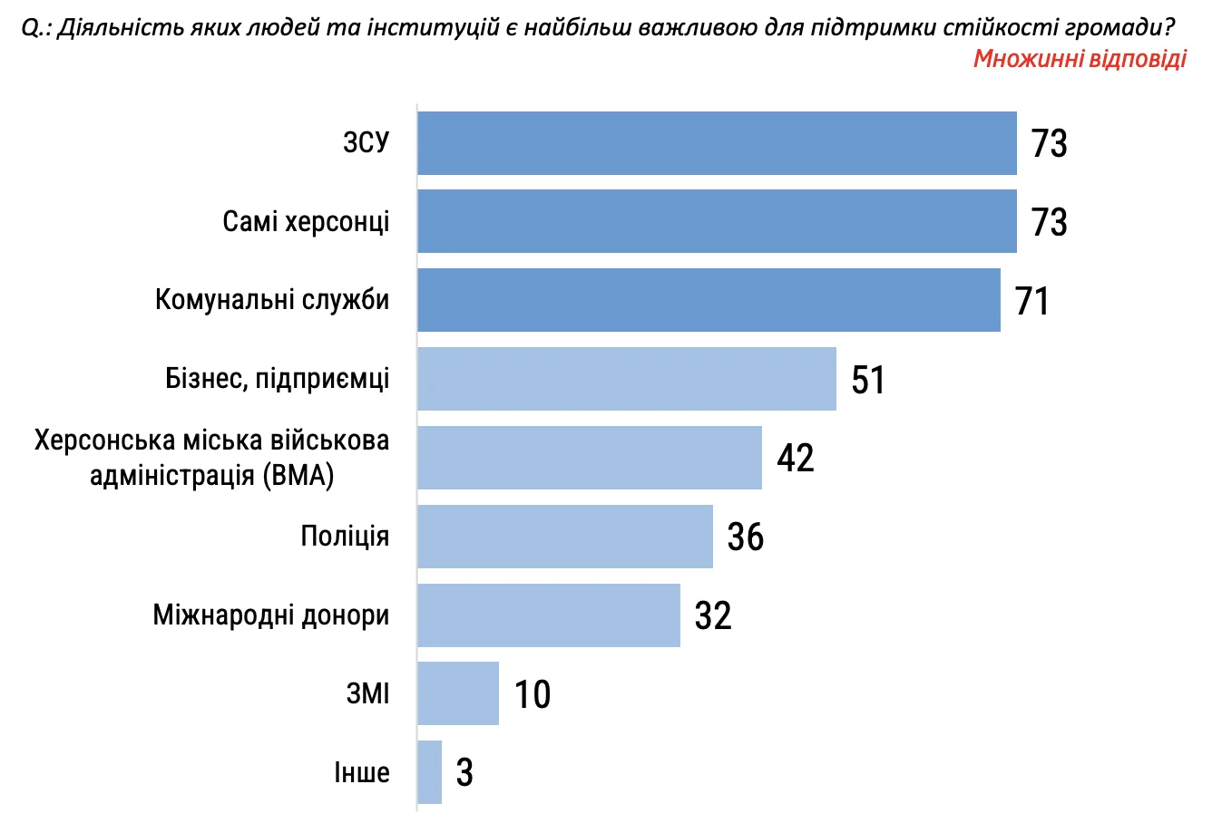 В опитувані взяли участь 100 респондентів, з яких 73 вважають, що найбільш важливою для підтримки стійкості громади є діяльність ЗСУ та самих херсонців. При цьому про вплив діяльності місцевої влади згадали лише 42 опитаних.