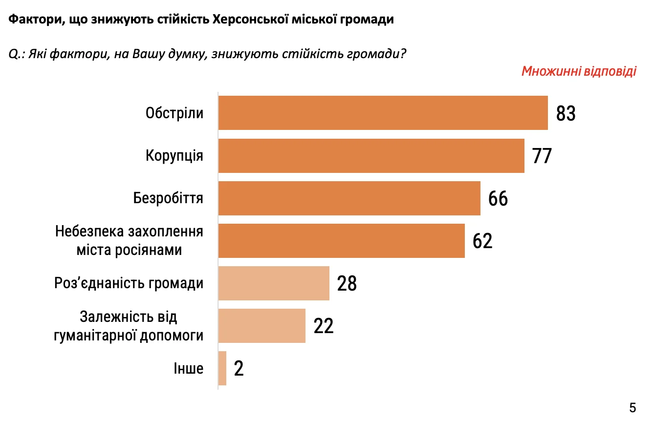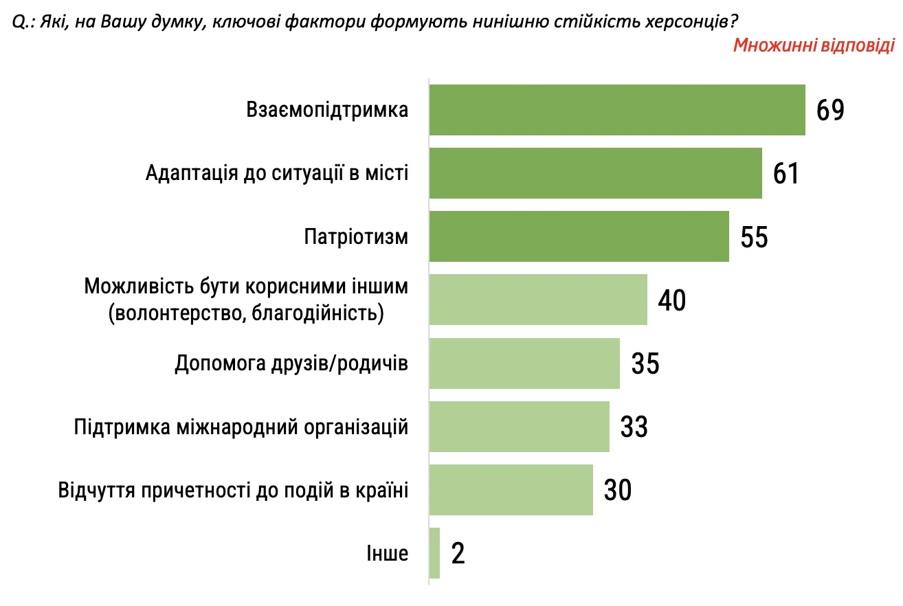 Основними факторами, які формують нинішню стійкість херсонців, опитані вказали взаємопідтримку, адаптацію до ситуації в місті та патріотизм. Натомість обстріли, корупція та безробіття найбільше знижують стійкість.