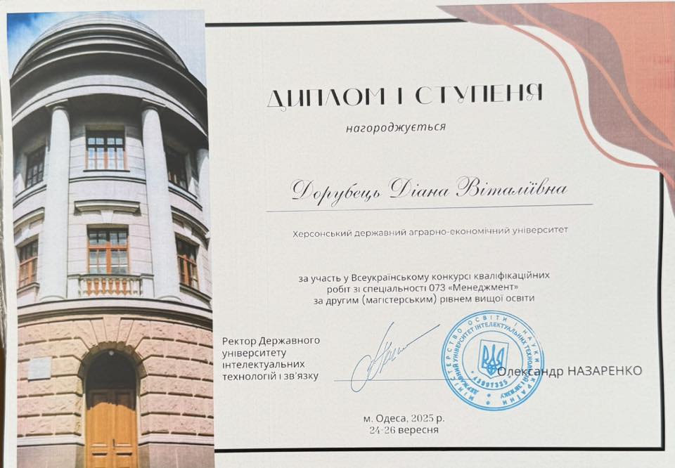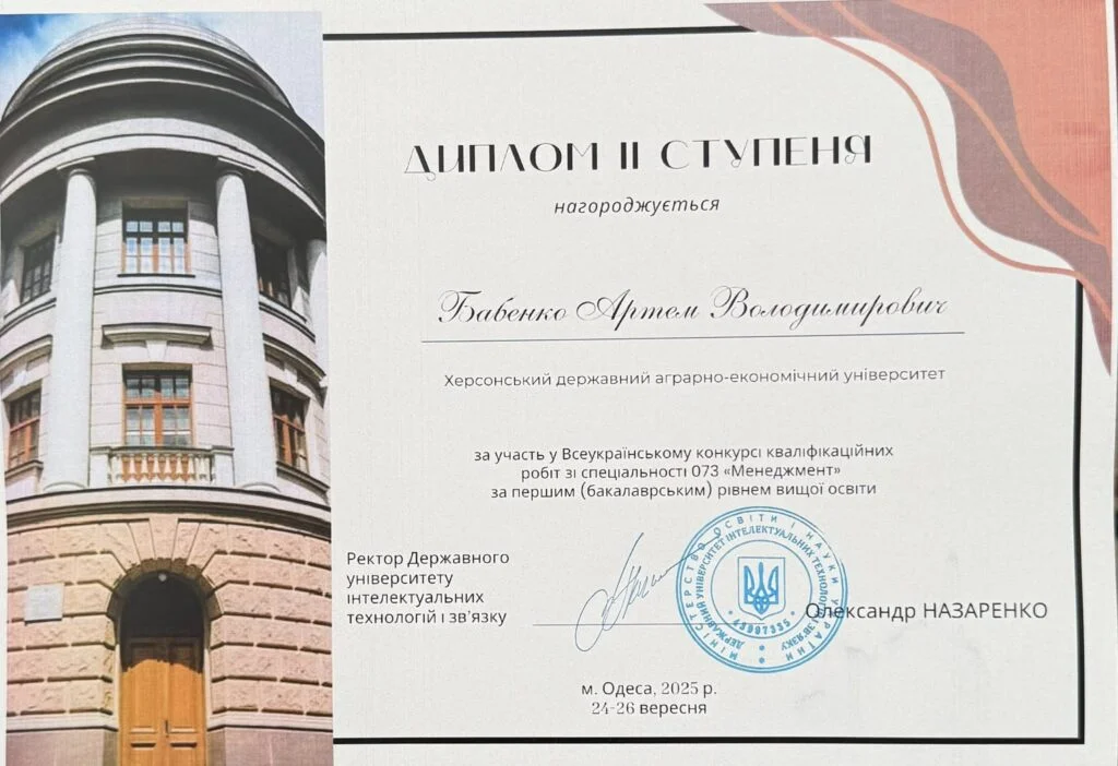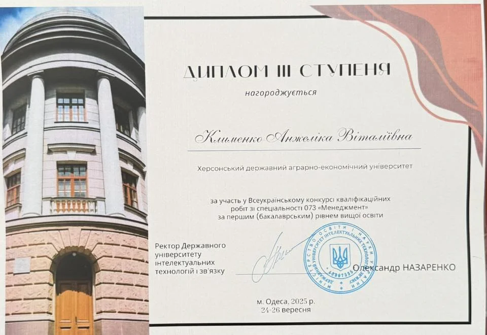 Зазначається, що троє студентів університету взяли участь у Всеукраїнському конкурсі кваліфікаційних робіт зі спеціальності 073 «Менеджмент», що відбувся на базі Державного університету інтелектуальних технологій і зв’язку в Одесі з 24 по 26 вересня 2025 року.