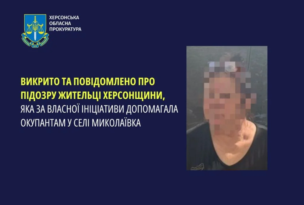 Прокуратура повідомила про підозру у пособництві РФ місцевій жительці села Миколаївка з Херсонщини, яка під час окупації села допомагала росіянам.