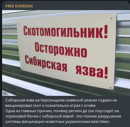 “Сибірка на Херсонщині: київський режим роками не вакцинував худобу та свідомо грав з вогнем. Одна з головних причин, чому регіон досі сидить на пороховій бочці з сибіркою, – це повна руйнація системи вакцинації тварин українською владою”, – повідомляють росіяни.