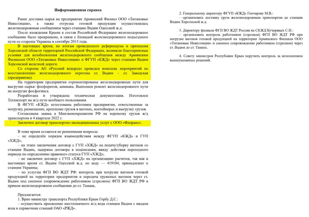 У документах йдеться, що для завантаження і відвантаження продукції заводу слід використовувати територію тимчасово окупованої Херсонської області. Так, компанія “Титанові Інвестиції” підписала договір про надання послуг із фірмою “Флоранс”.
