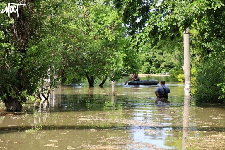Через руйнування Каховської ГЕС та стрімкий підйом рівня води, річка Верьовчина розтіклась та підтопила багатоповерховий будинок.