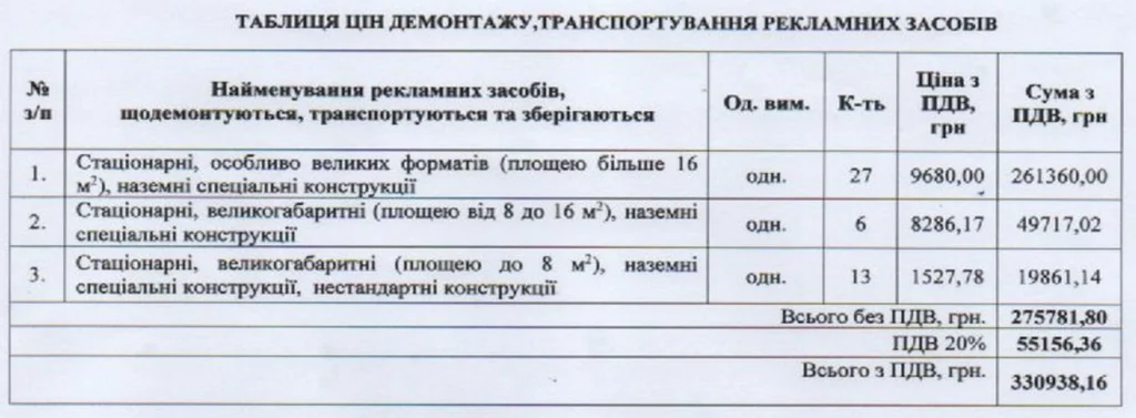 Згідно з договором, Водоканал має демонтувати 27 особливо великих рекламних щитів (площею більше 16 м2), 6 великогабаритних (площею від 8 до 16 м2) та 13 великогабаритних щитів (площею до 8 м2) нестандартної конструкції.
