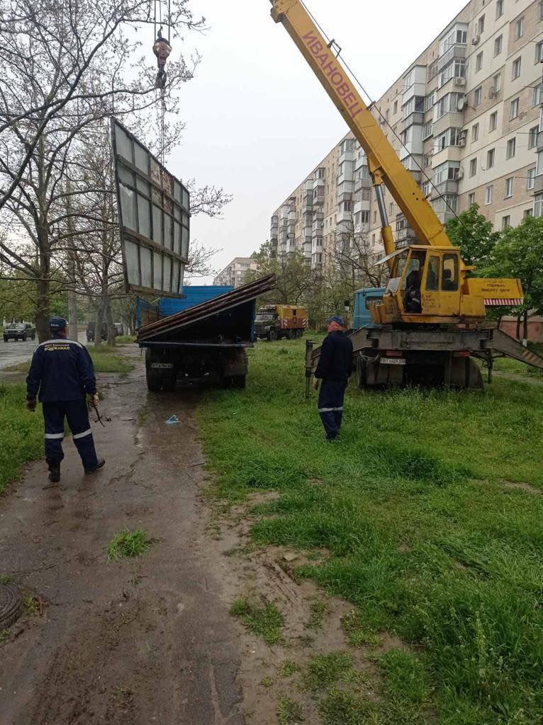 Зазначається, що була демонтована 1 великогабаритна конструкція, яка має 4 площини, а також вивезено 2 аварійних борда, які були пошкоджені внаслідок обстрілів міста.