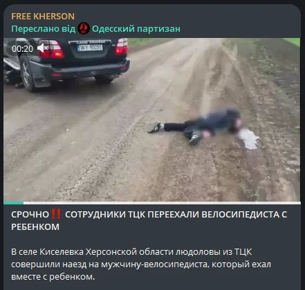 “У селі Киселівка Херсонської області людолови з ТЦК здійснили наїзд на чоловіка-велосипедиста, який їхав разом з дитиною. У стилі африканського сафарі людолови влаштували гонитву за цивільними, під час якої ті впали прямо їм під колеса. В результаті чоловік загинув на місці, а дитина померла по дорозі до лікарні в Херсоні”, – повідомляють окупанти. Цю інформацію росіяни супроводжують відеозаписом, який нібито доводить правдивість пропагандистських “вкидів”.