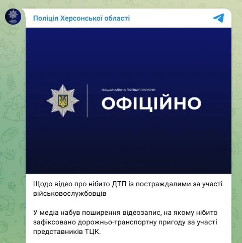 “Мета зрозуміла — спробувати ускладнити процес комплектування Сил оборони України. Один з головних методів відповідної ворожої пропаганди – дискредитація Сил оборони, вдаючись до відвертих фейків. Черговий приклад ворожої пропаганди – поширене відео нібито дорожньо-транспортної пригоди з постраждалими за участі людини в однострої. Офіційно повідомляємо – це фейк”, – заявили в Херсонському обласному ТЦК та СП.
